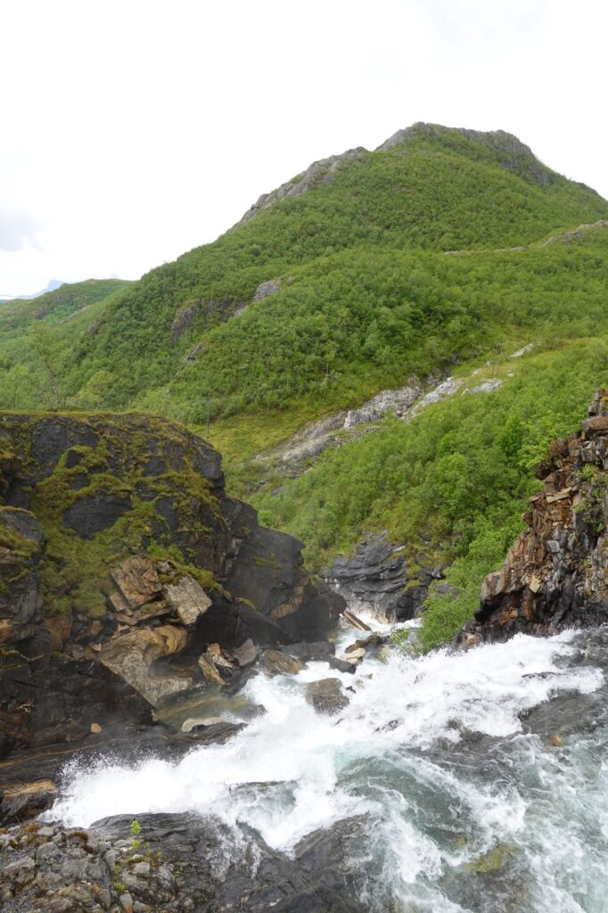 Nous nous faisons rattraper par 2 jeunes allemands, eux aussi en route pour le Cap Nord. Nous passons une première bonne montée qui nous fait bien transpirer, deux tunnels puis une belle descente qui nous refroidit immédiatement !
