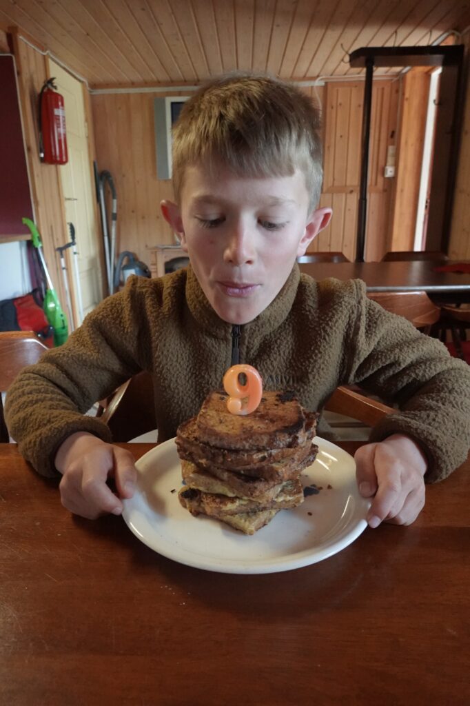 Mais ce midi, il fait beau alors nous nous installons sur la table de pique-nique située à côté d’un deuxième refuge plus ancien. Il abrite une guitare, les enfants nous improvisent une chanson chacun leur tour.