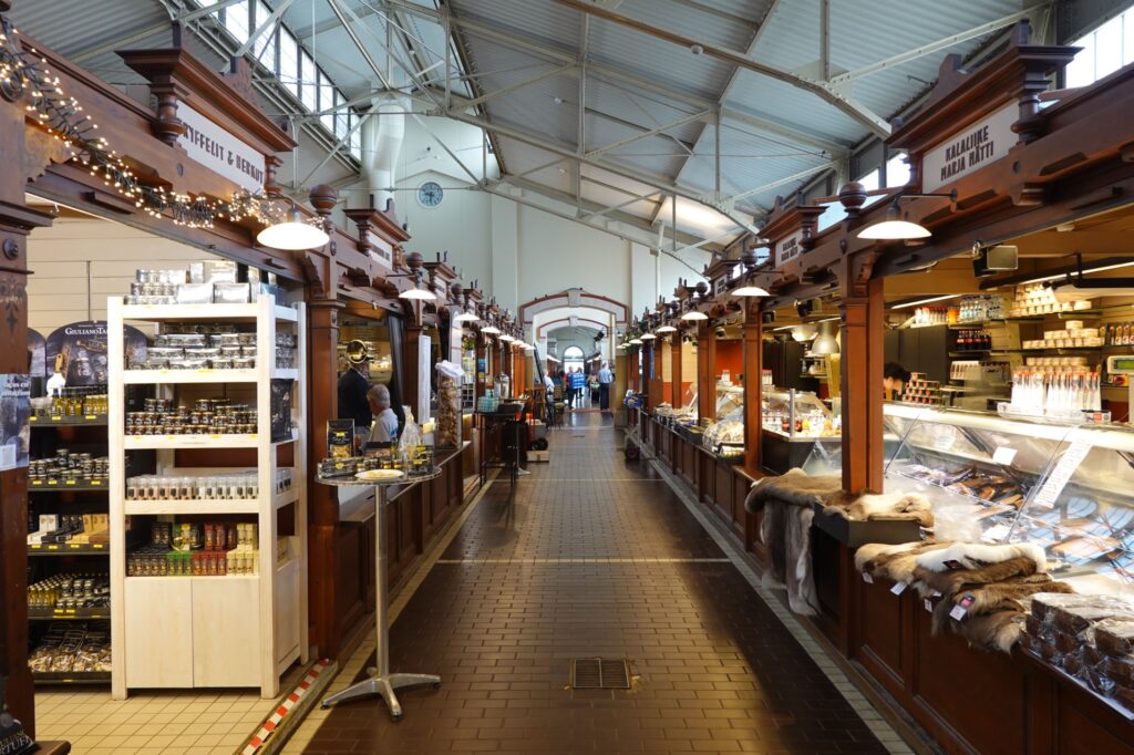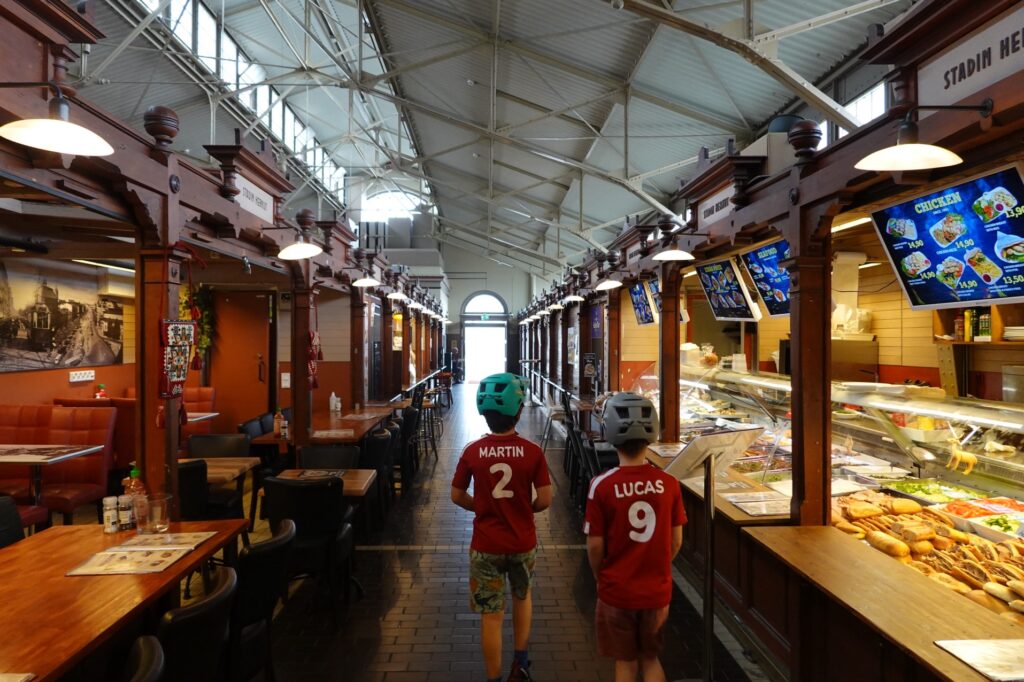 Le temps est couvert aujourd’hui, rien à voir avec hier mais il fait tout de même bon. Nous faisons une halte à la halle du marché. Nous étions juste à côté hier et l’avons raté. C’est bien dommage car pour le déjeuner, nous nous serions ré-ga-lés ! Tout nous fait envie, mais nous ne prenons rien, nous venons de manger !