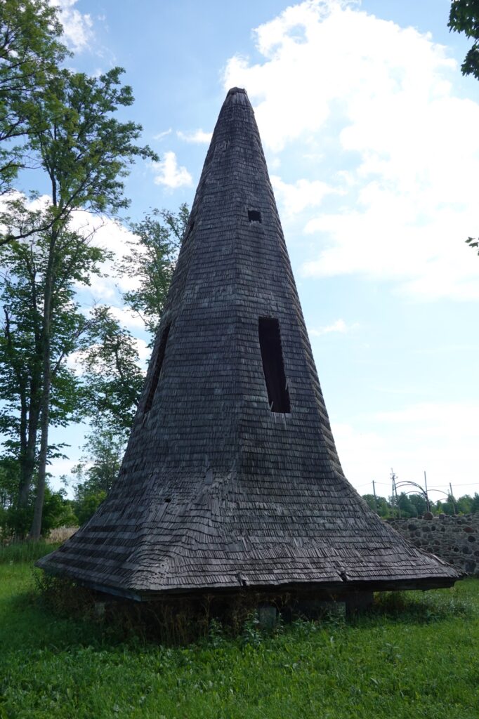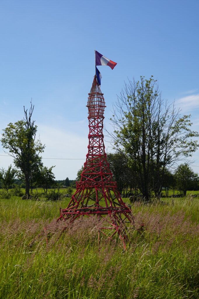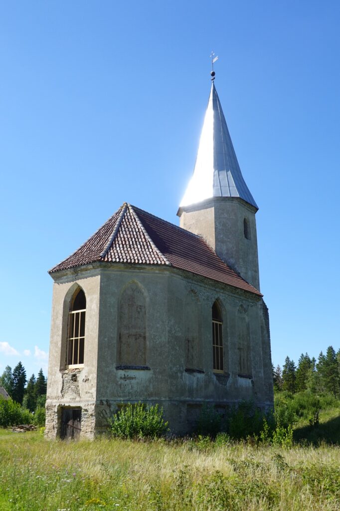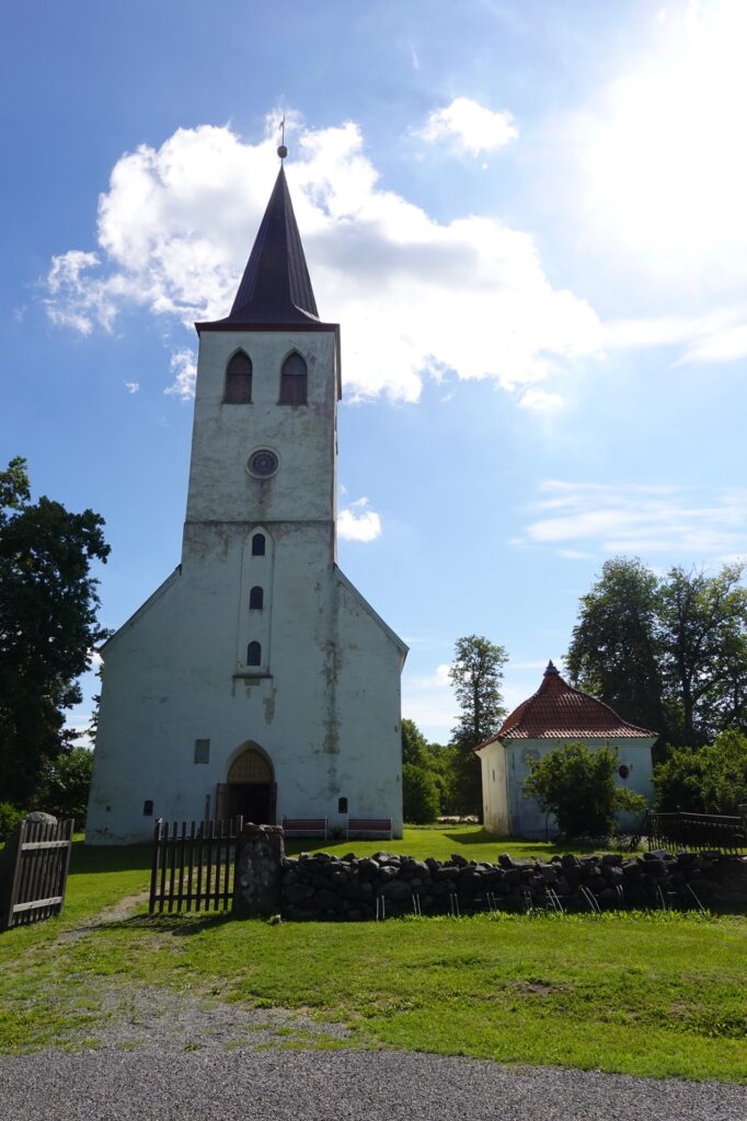 Il fait déjà chaud et le vent souffle toujours. Nous rejoignons rapidement l’axe principale. Un petit détour nous emmène voir l’église de Suuremõisa. Le clocher a été rénové, l’ancien est d’ailleurs un peu plus loin sur la route.