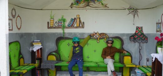 Nous sommes désormais en phase avec le vent (voilà qui change un peu). Nous sommes rapidement au supermarché pour notre deuxième session de courses. Il nous reste 5 km à parcourir jusqu’au camping que nous visons. Ils sont vite parcourus et nous pouvons installer les tentes dans ce qui ressemble plus à un gros jardin qu’à un camping. Les toilettes sèches ne plaisent pas trop aux enfants, ils espéraient plus de confort. La douche est également assez spéciale, il faut savoir se laver sans trop d’intimité. C’est aussi notre premier camping sans cuisine partagée, mais il n’est vraiment pas cher !