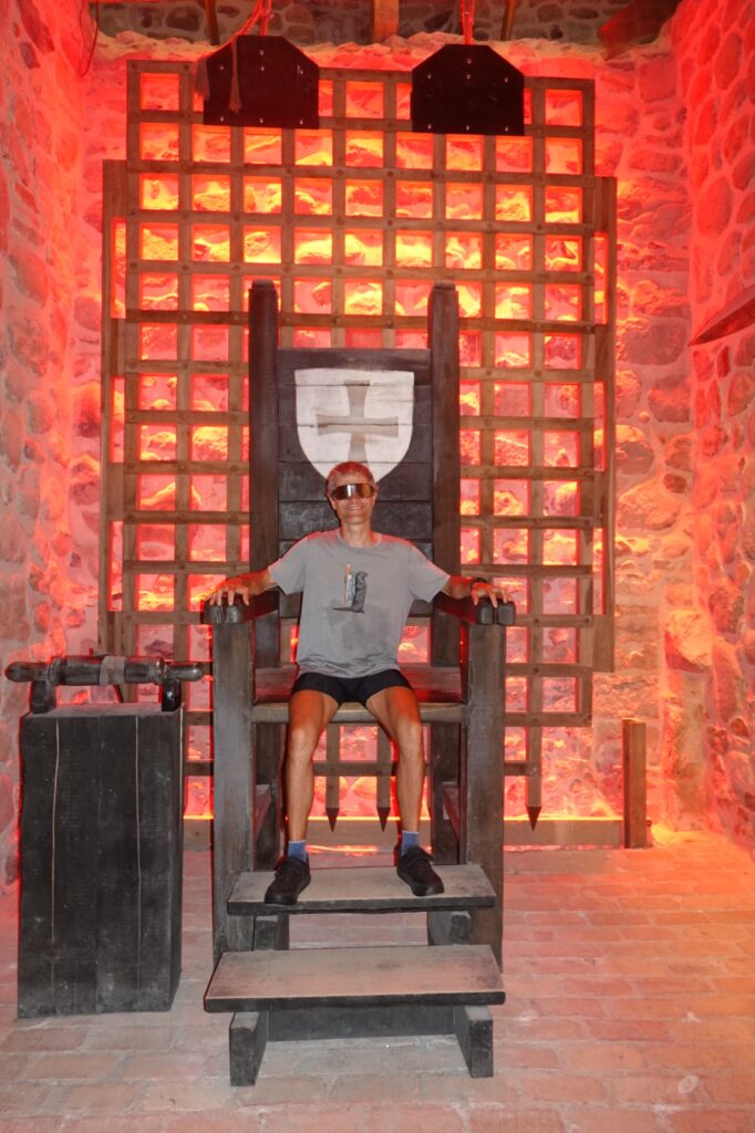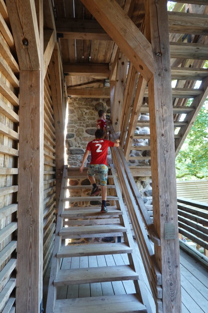 Nous commençons par aller visiter le château. Un parc nous permet d’accéder au nouveau château puis juste derrière, nous pénétrons dans celui d’origine, en partie restauré. C’est lui qui accueille le festival d’opéra. Nous montons dans une tour, de là, nous avons vue sur le parc national et le téléphérique. Tout est vert autour de nous.