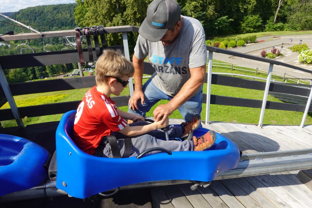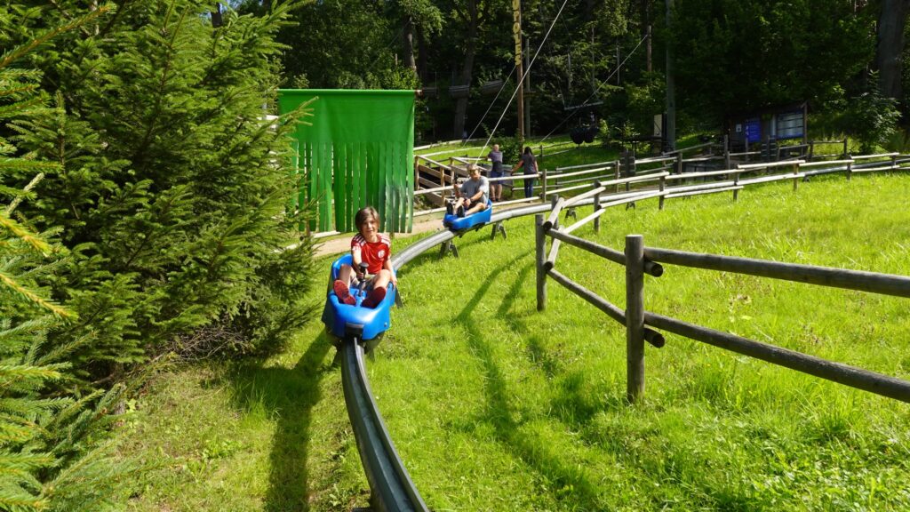Nous repartons sur nos vélos et passons devant une église. Nous suivons un itinéraire vélo recommandé par la ville et arrivons au sommet de pistes de ski. Une luge d’été nous fait de l’oeil, nous craquons et faisons tous une descente !